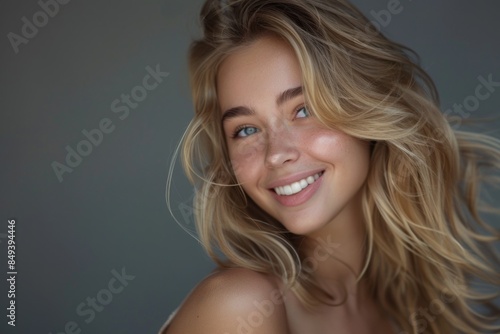 A portrait of a beautiful young woman with long blonde hair, smiling and looking directly at the camera