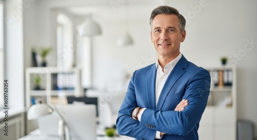 A portrait of a confident and successful mature businessman in a blue suit. A friendly male executive with arms crossed in a modern office.