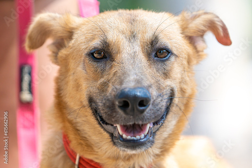 A portrait of a dog smiling and looking strait at you