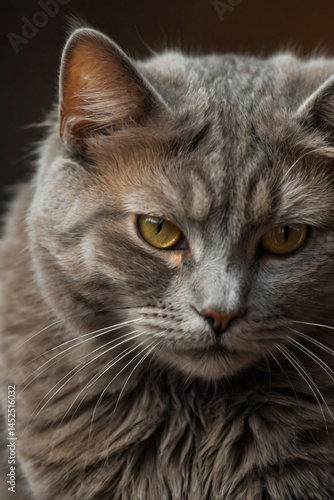 A portrait of a grey cat with a smooth, short-haired coat.