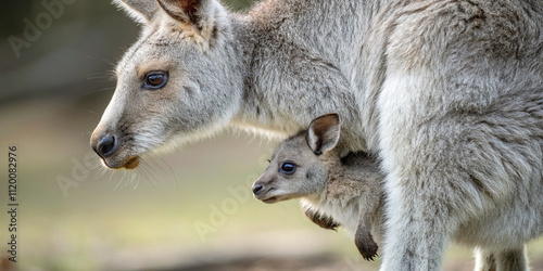 A portrait of a kangaroo with a baby in its marsupium. The mother kangaroo stands proudly, her strong, muscular build evident, while her baby peeks out from the pouch with curious eyes.