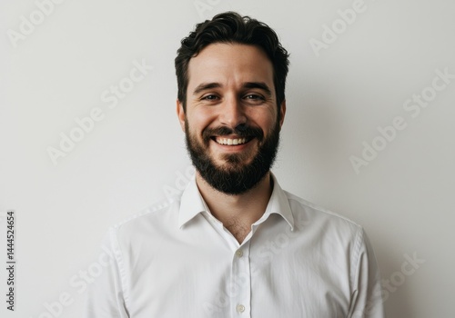 A portrait of a smiling man with a beard wearing a white shirt against a white background wall indoors