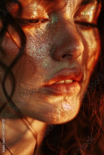 A portrait of a woman with her eyes shut, captured in a close-up shot