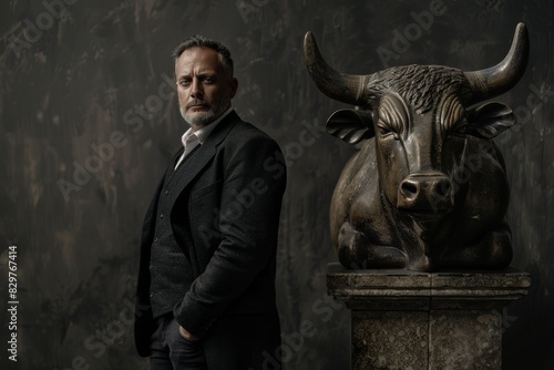 A portrait of an attractive businessman standing next to the black bull.