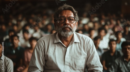 A portrait of an elderly man with glasses and a pensive look amidst a diverse group audience, representing wisdom, contemplation, and human connection.