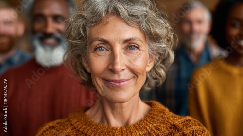 A portrait of an older woman smiling at the camera, with a group of people behind her. The image captures a sense of warmth, inclusivity, and shared experience