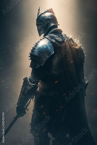 a portrait of brave soldier in full armor standing and holding a sword
