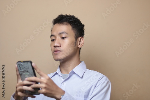 A Portrait of young Asian man using a smartphone isolated over cream background.