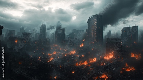A post-apocalyptic cityscape with towering buildings and rubble-strewn streets on fire under a gray, ominous sky.