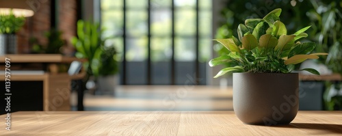 A potted plant sits on a wooden table, with a bright, modern interior and large windows in the background, creating a serene and inviting atmosphere.