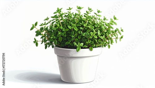 A potted thyme herb with small green leaves photorealistic detail white background with subtle lighting