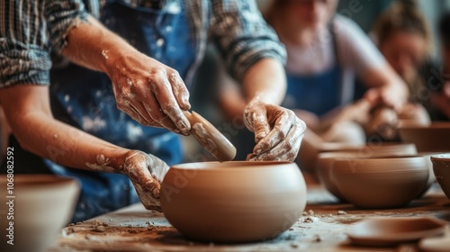 A potter's hands shape a clay bowl in a pottery class, surrounded by other students working on their own projects.