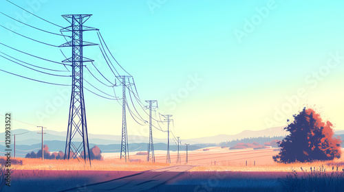 A power line crossing through a rural landscape with electric poles stretching into the distance, capturing the connection between technology and nature. Electric Fields. Illustration