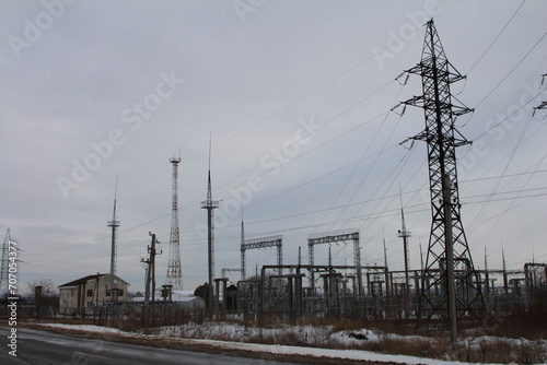 text, sky, snow, pylon, slope, day, powerline, power, electricity, energy, electric, line, tower, cable, industry, voltage, wire, electrical, blue, field, construction, road, high, building, sunset, line, industrial, landscape, pole, steel