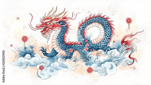 watercolor, dragon, chinese culture, illustration, mythology, fantasy, art, powerful, folk art, good luck, symbolism, culture, tradition, heritage, history, ancient, folklore, artwork, fine art, painting, graphic design, digital artwork, chinese new year, new year, celebration, luck, prosperity, fortune, strength, wisdom, protection, creative, design, vibrant, blue, red, gold, cloud, smoke, sky