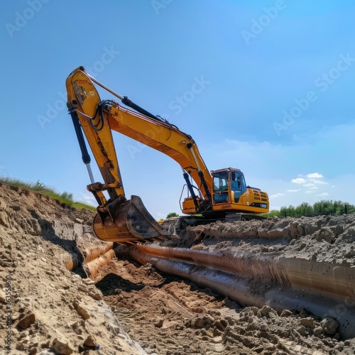 A powerful excavator digs the ground against a blue sky. Earthwork with heavy machinery at construction site View from a large concrete pipe. Clear sky