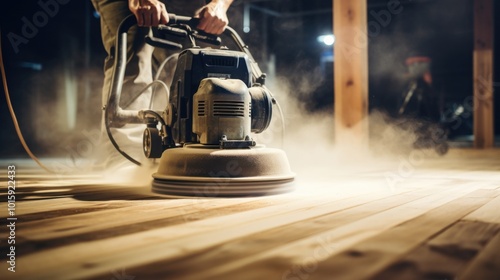 A powerful floor sanding machine works intensively on a wooden floor, enveloped in dust, showcasing industrial skill and precision.