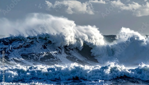 ocean, wave, water, sea, storm, powerful, crashing, spray, turbulence, white, blue, movement, energy, dramatic, nature, coast, horizon, sky, cloud, sunlight, texture, ripple, foam, breaking, swell, tide, rough, wild, dynamic, weather, wind, flow, majestic, force, impact, action, motion, intensity, coastal, surface, volume, depth, detail, brilliant, light, height, form, shape, view