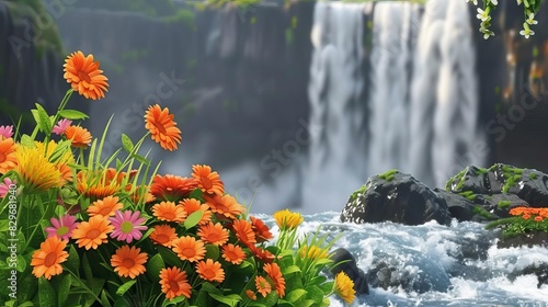 A powerful waterfall plunging into a river, creating a misty haze around the rocks and vibrant wildflowers nearby