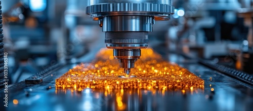 A precision machining tool operates over a glowing workpiece, highlighting industrial processes.