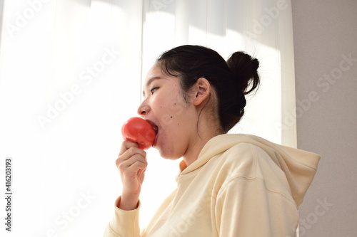 A pregnant woman in her twenties is eating tomatoes with a smile. A healthy diet during pregnancy is important.