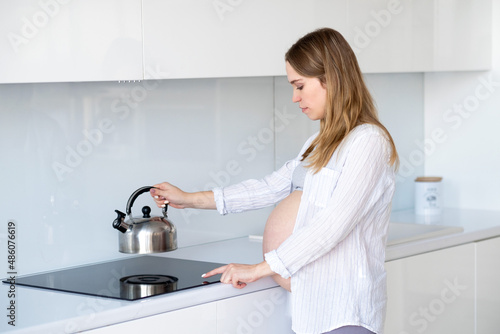 A pregnant woman in the kitchen puts the kettle on the stove. The concept of motherhood.