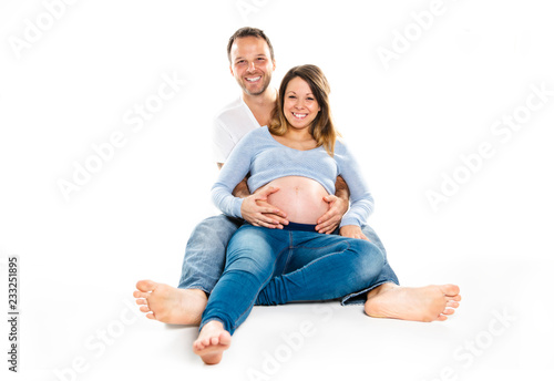 A Pregnant woman with man on studio isolated on white