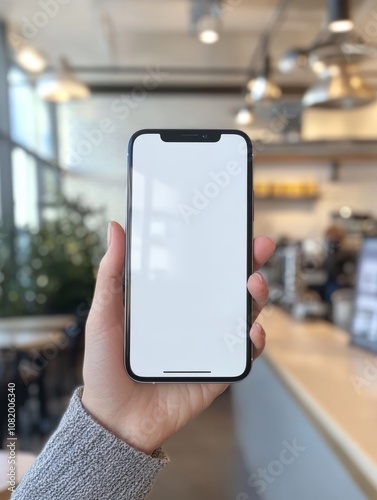 A pristine mobile phone mockup being held comfortably in a hand, presenting a clear and blank screen that is perfect for displaying app designs, advertising concepts, or promotional materials