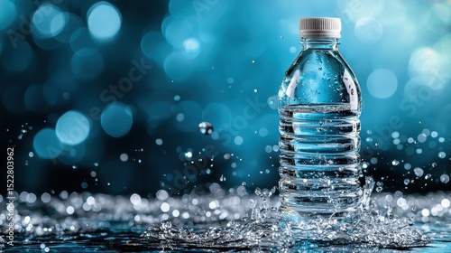A pristine, transparent water bottle stands tall amidst droplets of water, illustrating the importance of hydration and purity in a modern lifestyle and healthy living.