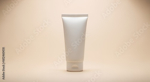 A pristine white cosmetic tube stands upright against a soft beige backdrop, showcasing its sleek and minimalist design.