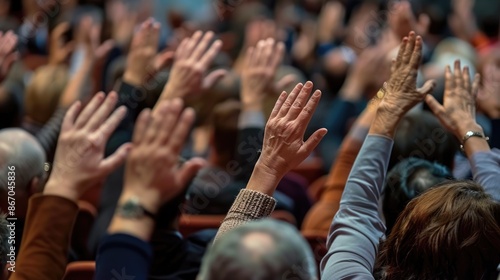 a professional business seminar, a diverse audience raises their hands in an important decision