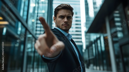 A professional businessperson in a black suit makes a stop gesture with a serious expression, captured in a close-up shot that conveys authority and confidence in a corporate environment.