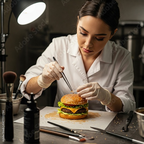 A professional food stylist applying sesame seeds to a burger bun using tweezers and food glue. The setup includes makeup brushes, mini spatulas, and lighting gear..