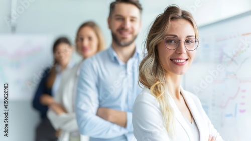 A professional group portrait featuring four individuals, with a focus on a smiling woman in the foreground, representing teamwork and collaboration in a business environment.