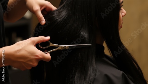 A professional hairdresser giving a haircut, scissors in hand, hair falling onto the salon floor