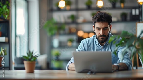 professional, male, employee, laptop, contemporary, office, minimalistic, decor, bright, lighting, clean, efficient, focused, copy, space, businessman, work, technology, setting, corporate, environment, productivity, indoor, high, detail
