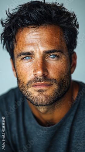 A Professional Male Portrait with Blue Eyes, Wearing a Gray Round-neck T-shirt, Featuring Dense Eyebrows and a Serious Expression
