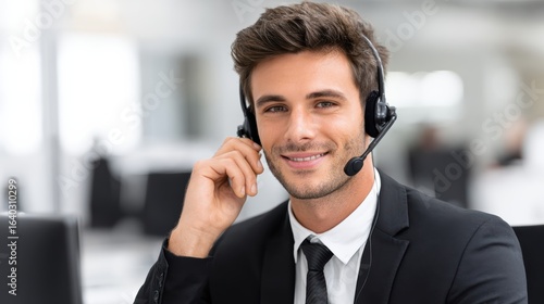 A professional man in a suit wears a headset while smiling, likely engaged in customer service or support in an office environment.