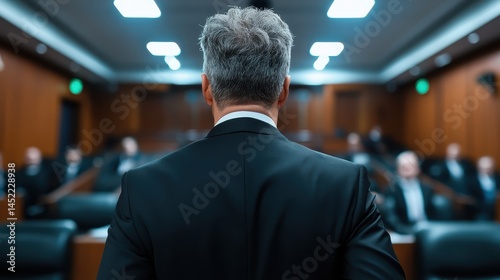 A professional man stands with a serious demeanor, turning to address an audience in a judicial setting, exemplifying the gravity and importance of the courtroom proceedings.