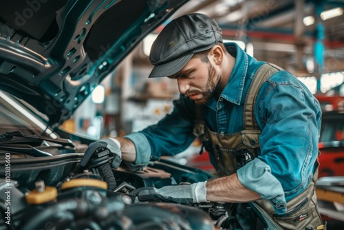 A professional mechanic works on a car in a car service center. A repairman deals with routine vehicle maintenance. Modern clean workshop.