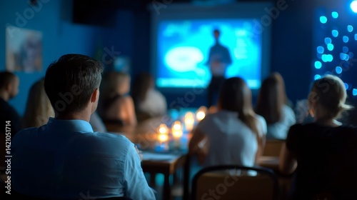 A professional presentation in a dimly lit room with an audience engaged in a corporate setting, focusing on learning and growth.