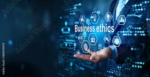 A professional showcasing a holographic display of business ethics icons, representing principles like integrity, transparency, and corporate responsibility. Ideal for business, ethics training