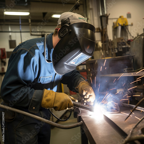A professional welder, welding with protective gear, a spark coming out of the weld. A student welding in a university workshop with appropriate safety equipment.