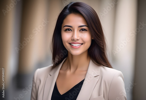 A professional young business woman portrait. A young woman with a warm smile. She has long hair. Her expression is friendly and approachable, showcasing her clear skin and bright eyes.