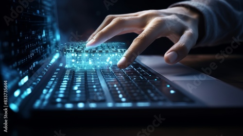 A programmer intently working on a computer code, fingers flying across the keyboard,