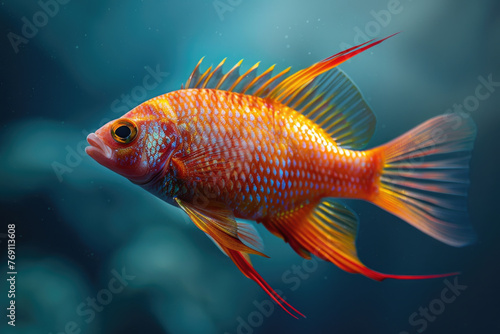 A purebred fish poses for a portrait in a studio with a solid color background during a pet photoshoot.