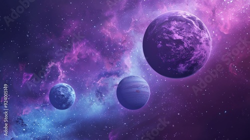 a purple and blue background with three planets