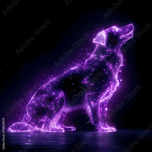 A purple glow dog silhouette in a nightscape, bold outline, energy-charged luminous pointillism, wireframe, tenebrism mastery style, UHD 8k, Unreal Engine 5 on black background