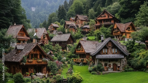 A quaint village with houses and structures made entirely of wood, old-world charm,