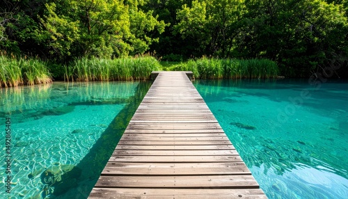 a quaint wooden dock extends over clear turquoise waters offering a perfect spot for relaxation or contemplation surrounded by lush greenery and serene nature